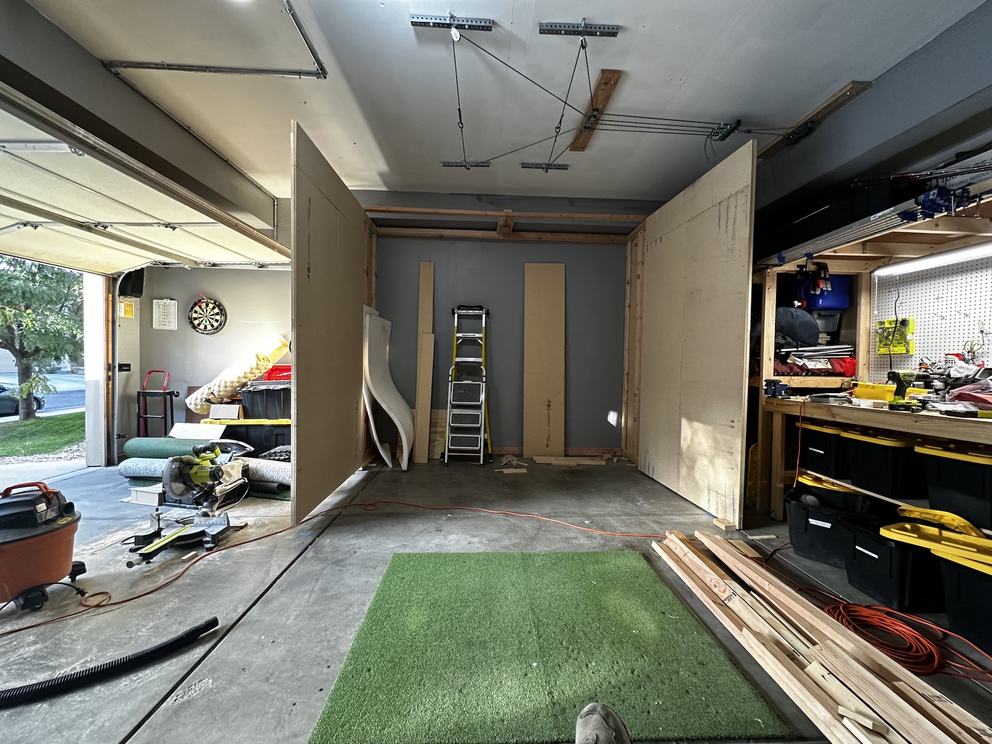 Now I’m in my third year of my garage golf sim and decided to pull out all the stops. My biggest gripe with having the simulator was that I couldn’t use my garage while it was up. It just took up too much space. I saw this company was making murphy-bed style folding simulators. This seemed like the perfect thing, but they ain’t cheap. I figured I could design and build one myself for a fraction of the price.